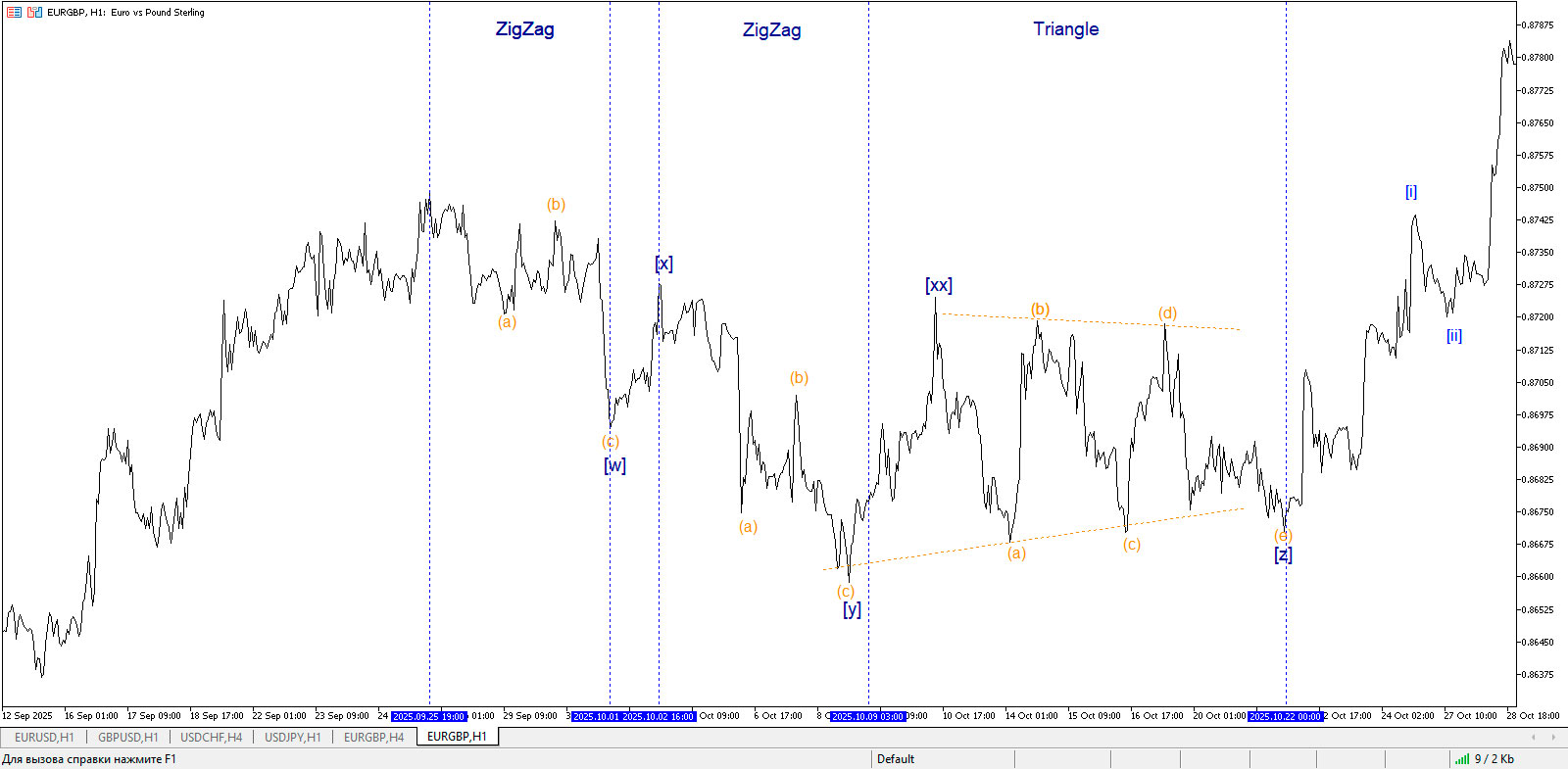 25.09. 2025 – 22.10.2025 Нисходящая тройная тройка [w] [x] [y] [xx] [z] на паре EURGBP на минутном волновом уровне. ЗигЗаг, ЗигЗаг и Сходящийся треугольник.