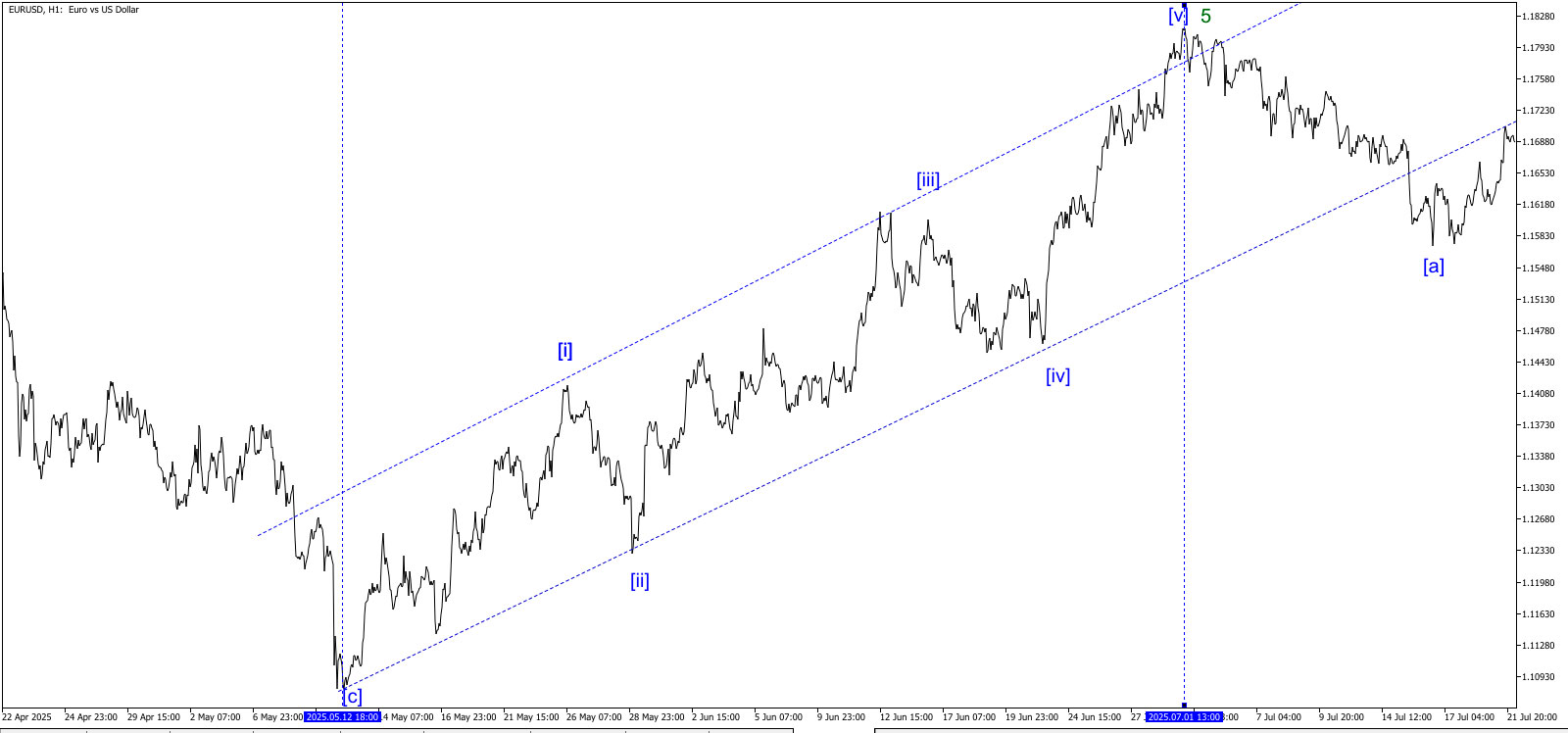Рис. 1 Рис. 2 С 12.05.2025 – 01.07.2025 на паре EURUSD ярко выраженная структурированная волна 5 на Мелком волновом уровне. ! В волне [iii] Минутного уровня- неудавшаяся (v) Маленького уровня.