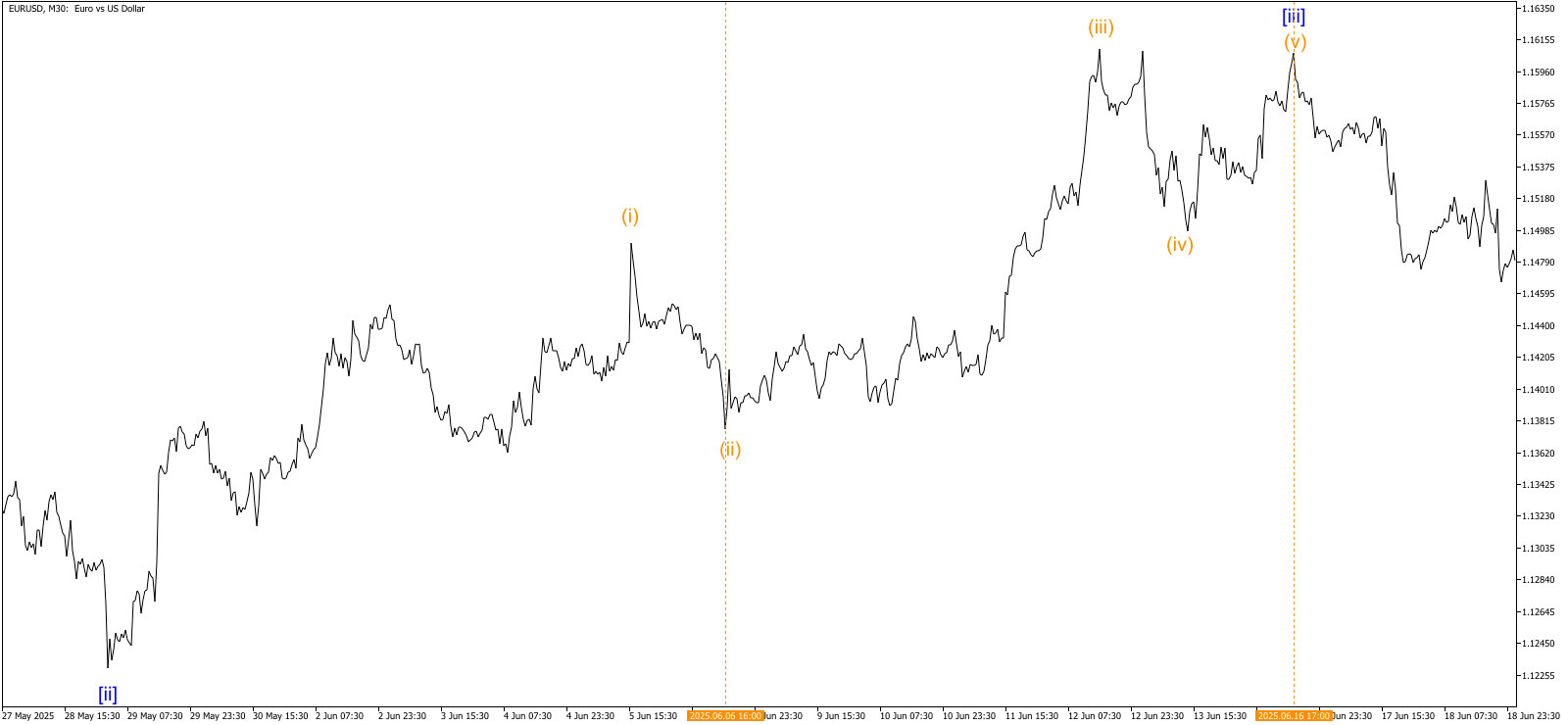 С 06.06.2025 – 16.06.2025 неудавшаяся волна (v) на маленьком волновом уровне в волне [iii] минутного волнового уровня на EURUSD.