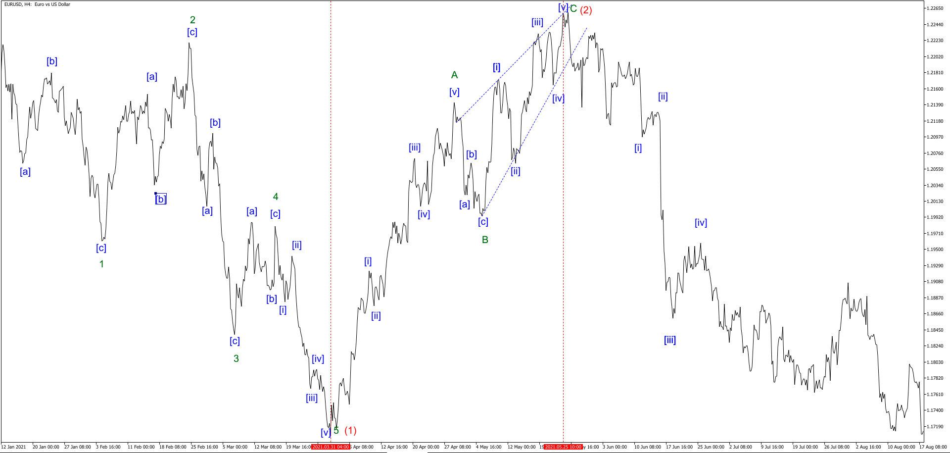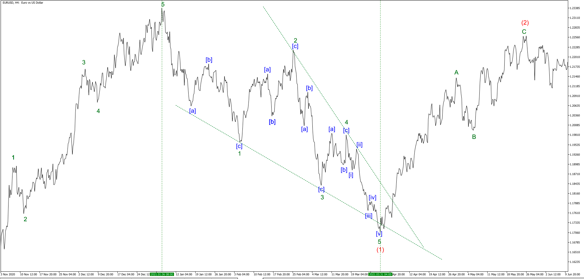 31.03.2021 – 25.05.2021 на EURUSD восходящий Зигзаг с чередованием в действующих волнах. Волна А – Стремительный импульс с удлинением в волна [i]. Волна С – Конечный сходящийся диагональный треугольник.