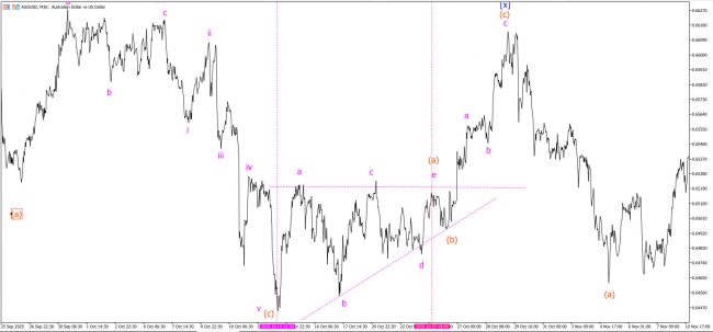 Рис. 1 Рис. 2 С 14.10.2025-23.10.2025 на AUDUSD. Восходящий барьерный треугольник на сверхмаленьком волновом уровне в качестве волны (a) от [x] в двойной тройке.
