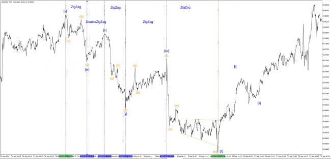 Рис. 1 Рис. 2 Тройной ЗигЗаг в качестве волны В ЗигЗага более старшего волнового уровня 29.08.2024 – 11.09.2024 – Нисходящий тройной ЗигЗаг [w] [x] [y] [xx] [z] на AUDUSD на минутном волновом уровне в качестве волны В зигзага, !Волна (с) зигзага [z] – конечный диагональный треугольник.