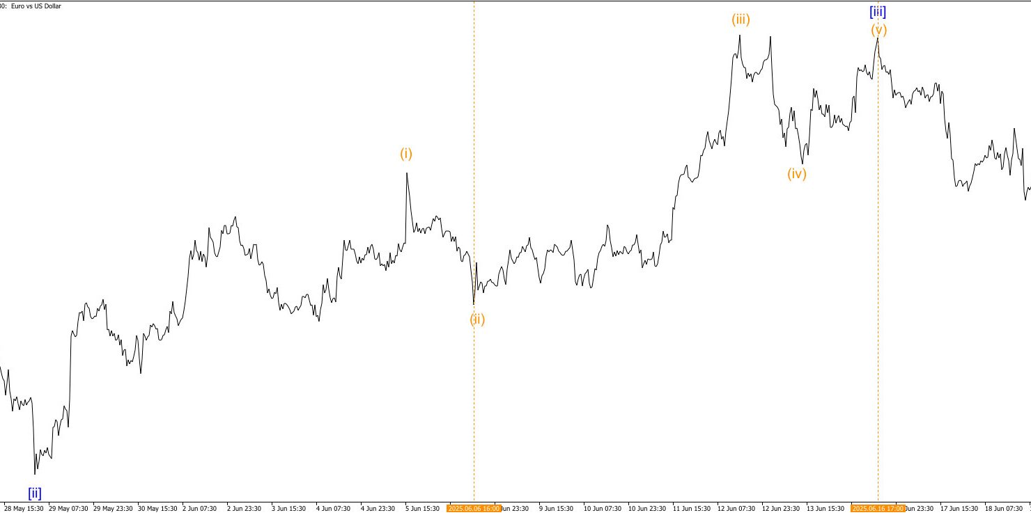 С 06.06.2025 – 16.06.2025 неудавшаяся волна (v) на маленьком волновом уровне в волне [iii] минутного волнового уровня на EURUSD.