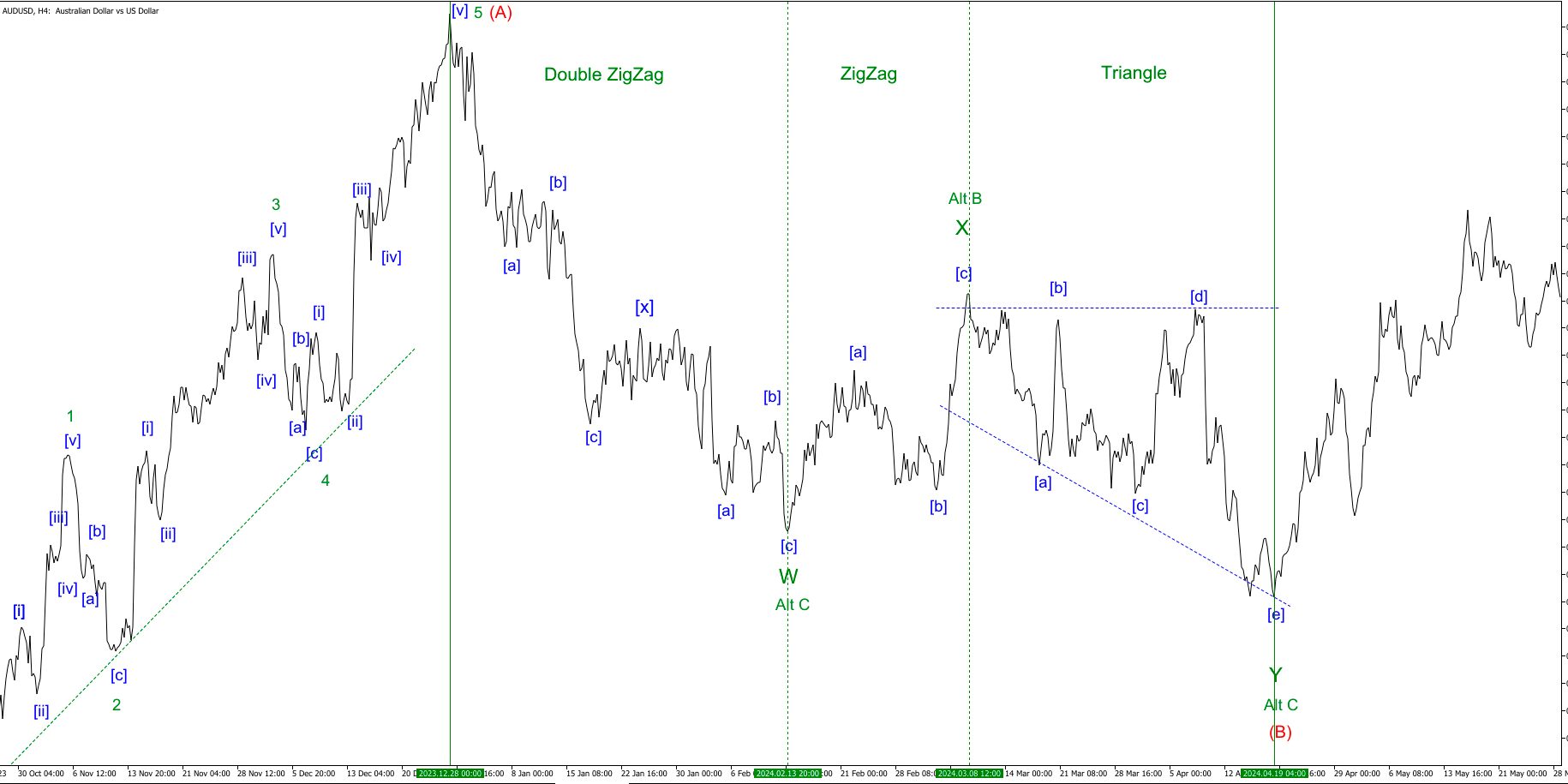 28.12.2023 – 19.04.2024 AUDUSD Нисходящая двойная тройка W-X-Y на мелком волновом уровне. (Альтернативная разметка A-B-C).