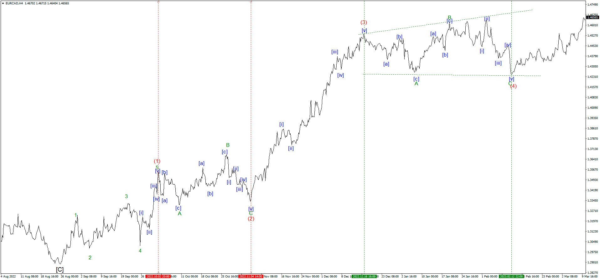 С 02.10.2022 по 04.11.2024 на паре EURCAD нисходящая растянутая волновая плоскость A-B-C на мелком волновом уровне (Minor) в качестве волны (2) – среднего (Intermadate) волнового уровня. (Рис.2).