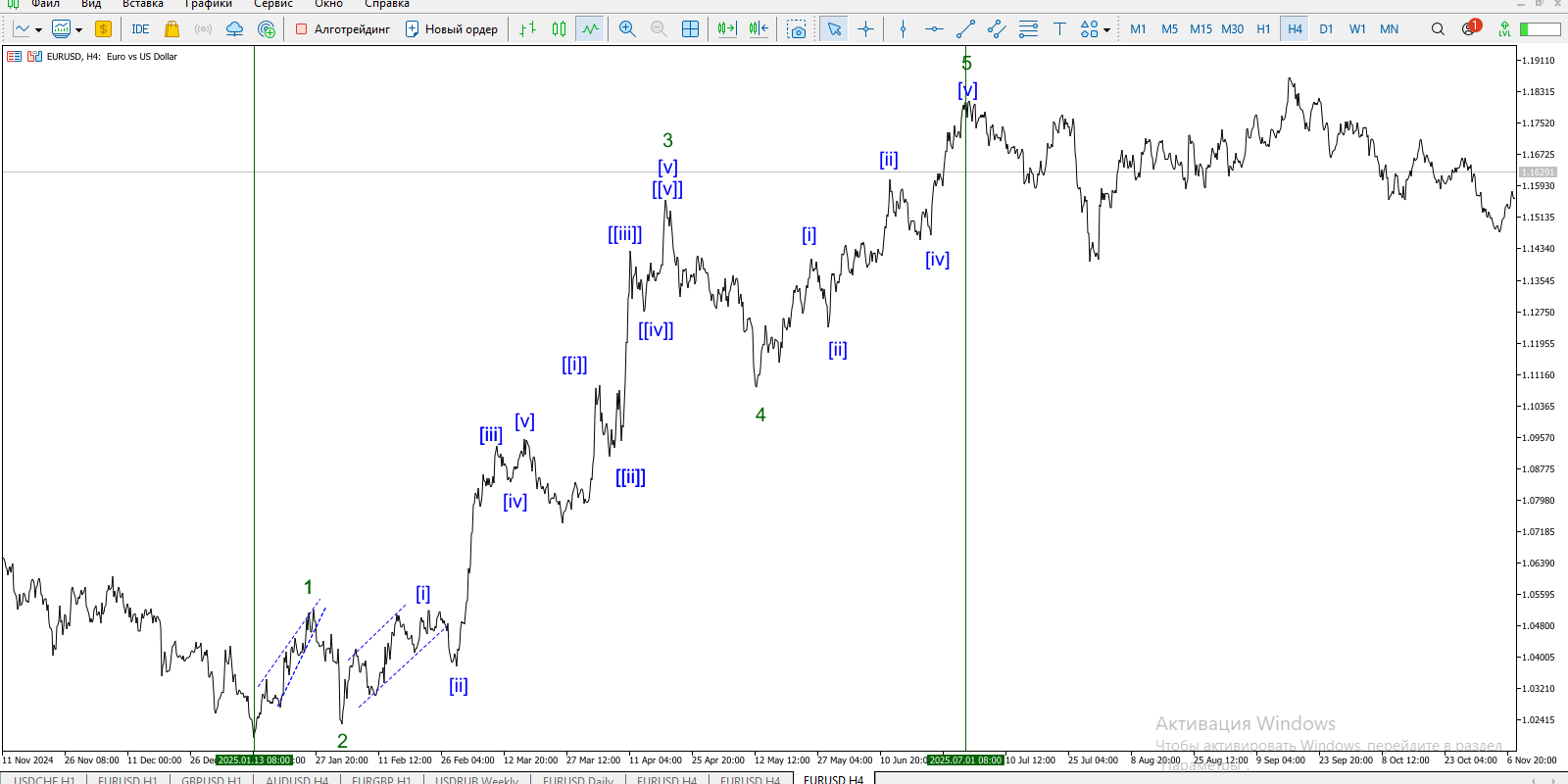 С 13.01.2025 – 01.07.2025 стремительный импульс на 1 – 2 – 3 – 4 – 5 с удлиненной волной 3 на Минутном волновом уровне. Навигация по записямПредыдущаяПредыдущая запись:Конечный диагональный треугольник на минутном волновом уровне на паре EURUSDСледующаяСледующая запись:Чередование в двух действующих волнах ЗигЗага на EURUSD