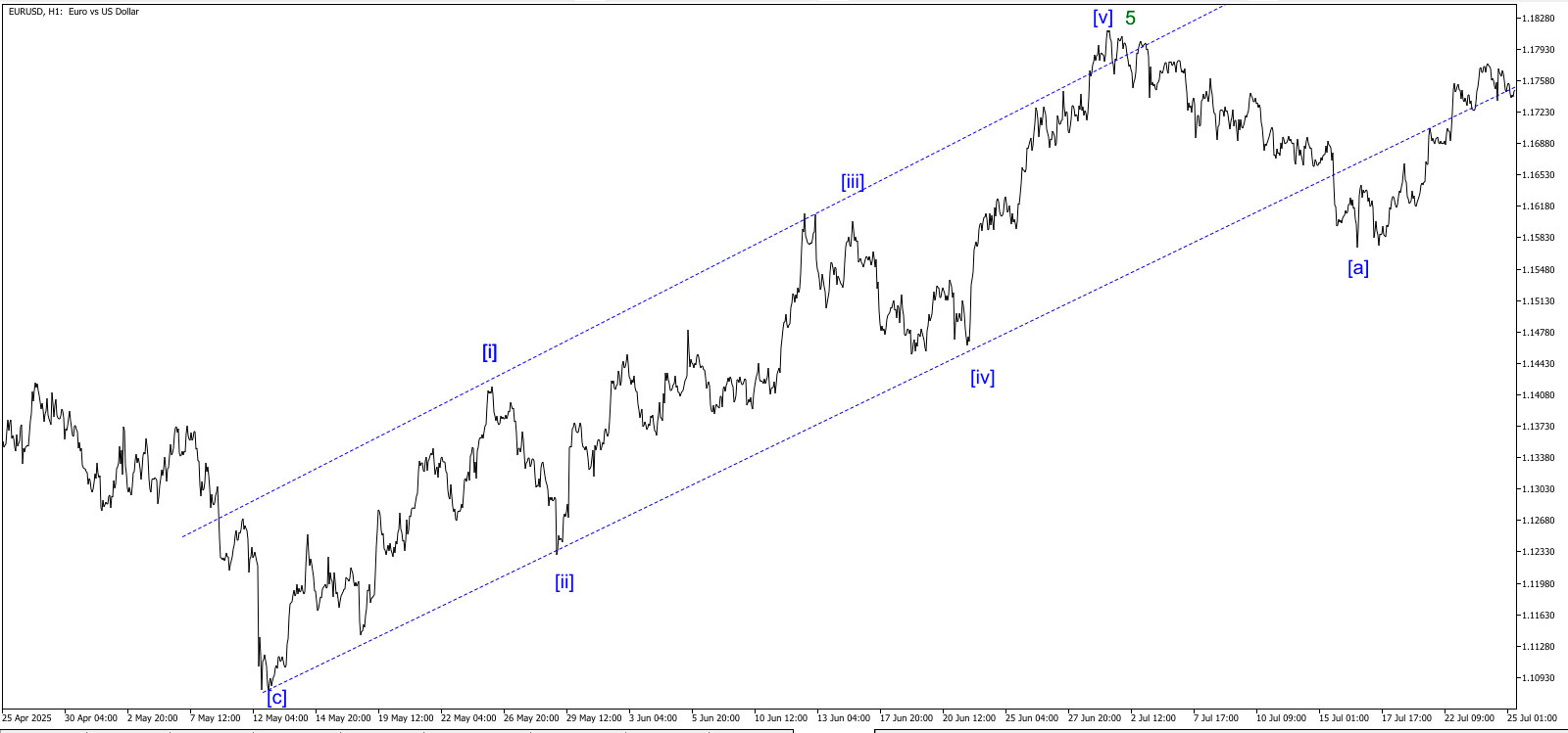 С 12.05.2025 – 01.07.2025 на паре EURUSD ярко выраженная структурированная волна 5 на Мелком волновом уровне.